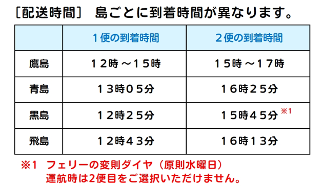 青島・飛島・黒島はフェリー乗り場での受け取りとなります。